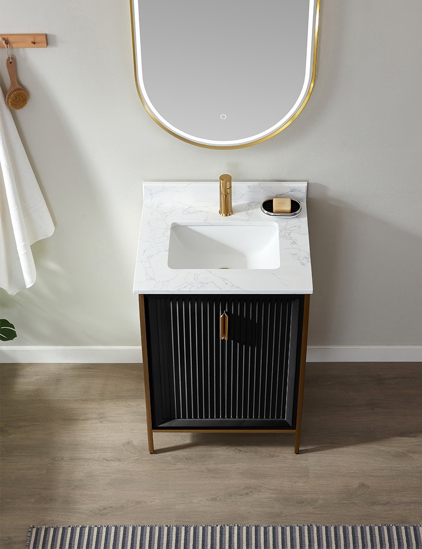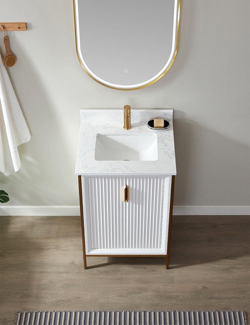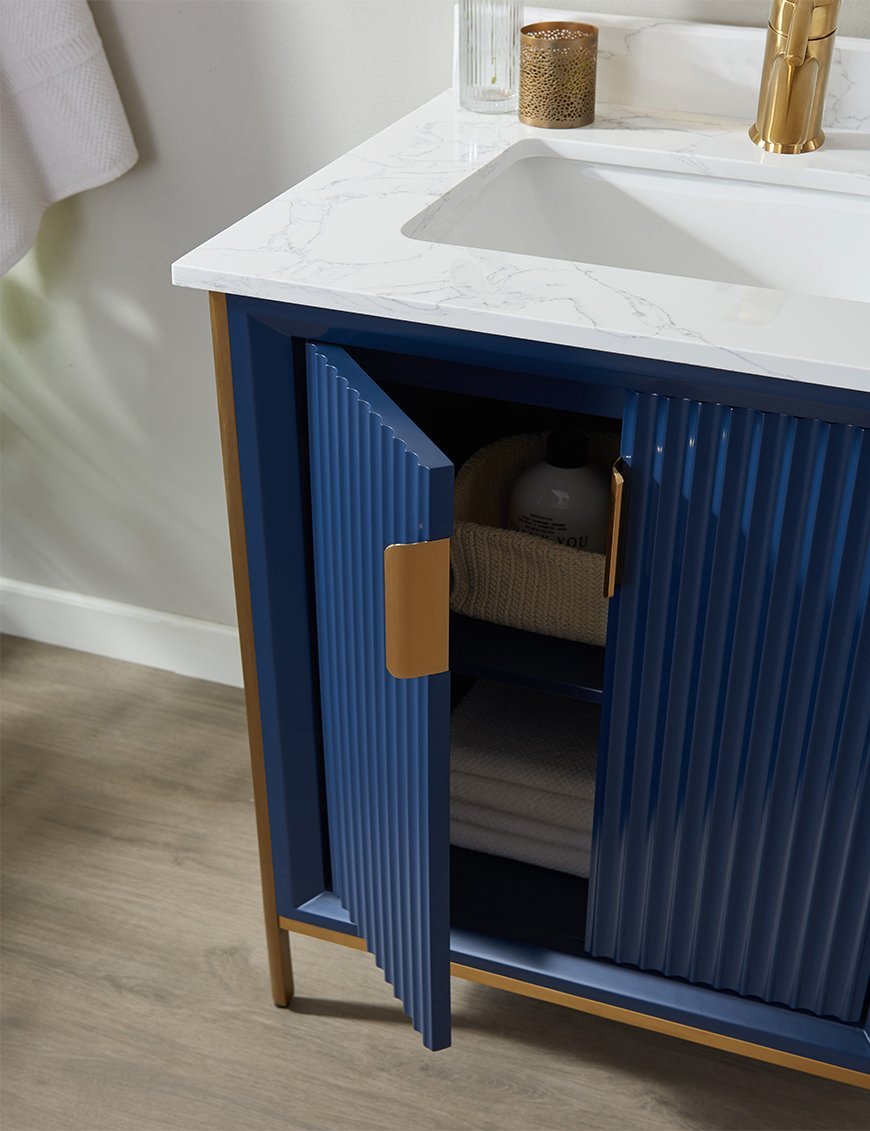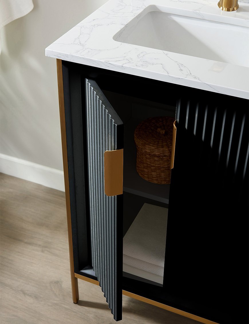 Redefine luxury with the Aria Vevo Elite Collection, a premium solid maple wood bathroom vanity crafted for elegance and durability. Featuring exquisite fluted detailing and brushed gold hardware, this vanity blends timeless design with modern sophistication, making it a statement piece for any bathroom.